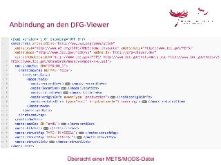 Zur Darstellung von Digitalisaten im DFG-Viewer wird eine reduzierte Version des METS/MODS-Formats verwendet. In dieser Datei werden diejenigen Informationen beschrieben, die für die Anzeige im DFG-Viewer relevant sind: